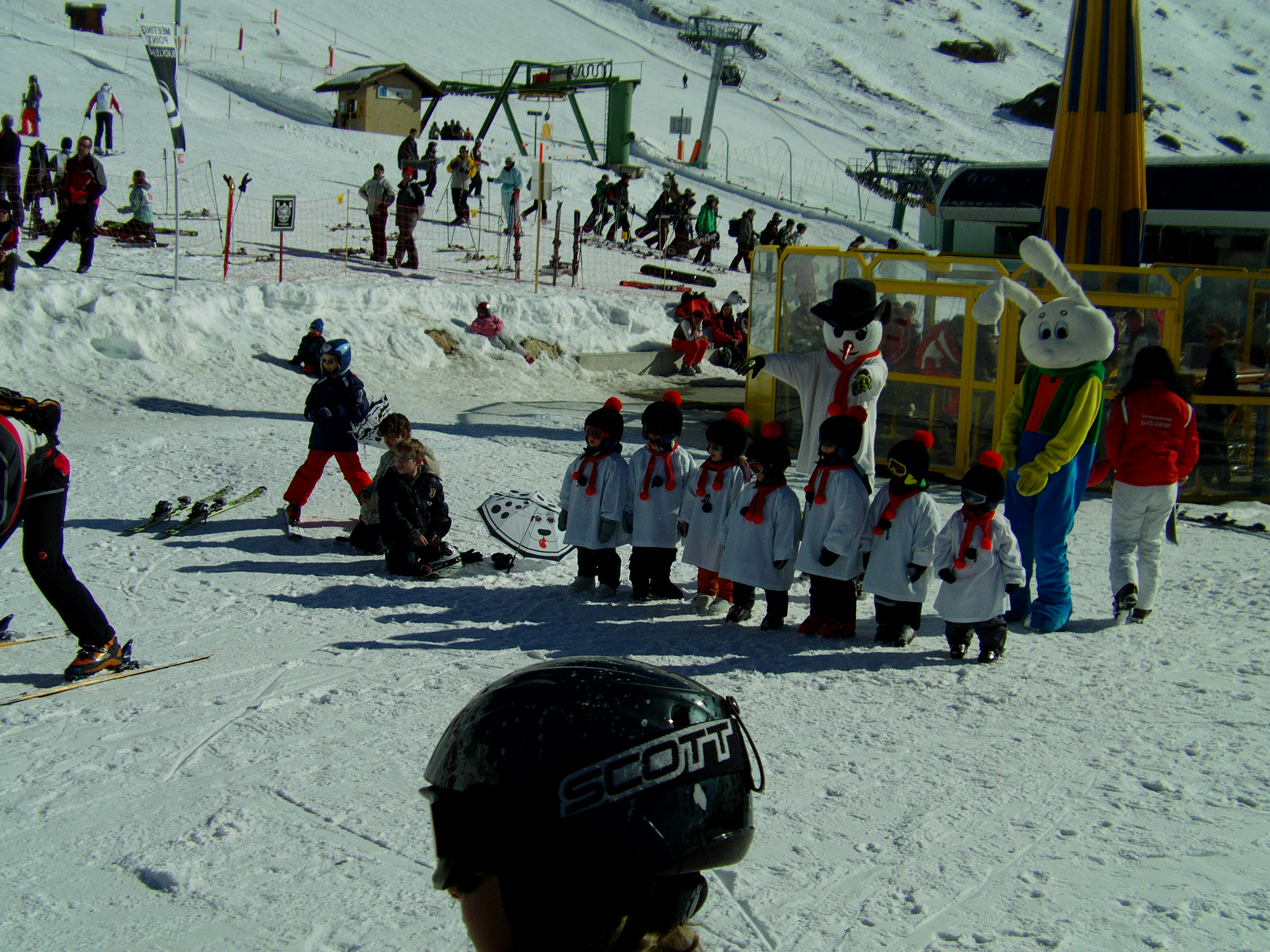 Schneemannrennen mit Katrin (links, stehend mit roten Hosen und Helm) und Philipp (3. von rechts), Snowli und Schneemann, 11.02.2011